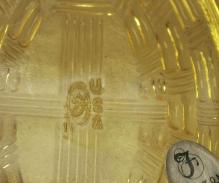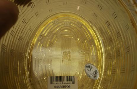 | As has been mentioned here several times, Fenton's Quality Control checks each item thoroughly. If that item does not meet Fenton's strict requirements the piece it is deemed a Second, and permanently marked that way. Items that were to have been Limited Editions have all reference to that sandblasted off, which is also done to logos that have already been applied. Below are some common marks used to identify Fenton wares that are not of First Quality. While some of these items make their way to eBay via purchases from the Fenton Gift Shop's Bargain Bin, that in no way is meant to imply that only Seconds are sold through the Gift Shop. Quite, to the contrary! Many wonderful, and unique First Quality items can be found there! Below, left to right are: Dancing Flame, Double Star (singles also used), and Block F. The letter "F" scratched into the surface of a piece also identifies it as a second. |