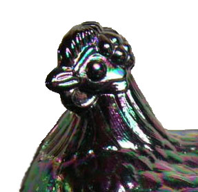 | <---- Face and eye detail of Fenton's 8" Hen on Nest ware #5182 CN, in Carnival from 1970-1974. Many are marked with Fenton's logo. Some early carnival & milk glass 8" hen on were put into production before Fenton began marking with embedded logos. The original Atterbury Hen top Fenton copied for the development of Fenton's first Hen top, featured empty eye slots which Fenton solved by making big, bulging eyes. The big bulging eyes of Fenton's large Hen Tops have since become a renowned identifying trait.lack of eyelids and details, which Fenton's hen top from their 5" hen on nest #5186 clearly have, as shown below. |
