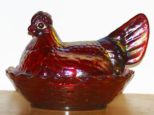 | Fenton 5" Hen on Nest, #5186 YOP: 1967-not retired as of 1/08 Shown: #5186 RX, Ruby Marble (slag) |