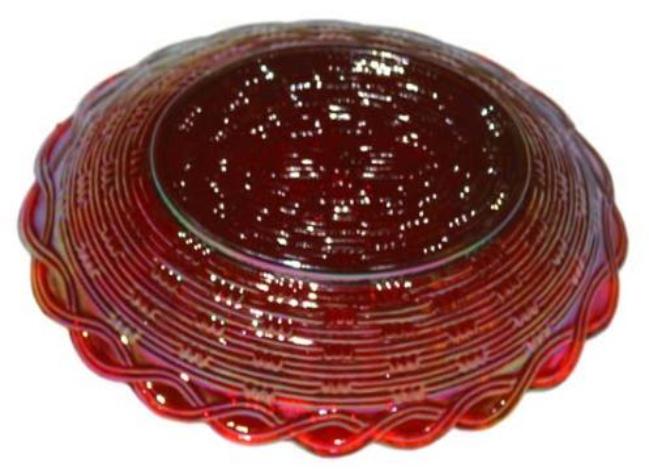 "Technically," the Gibson Overseas Copy of Fenton's 8" ware # 5182 Hen on the scallop rim Nest appears to possess many features and meet several criteria of Fenton's 8" hen on nest. However, a visible feature of Fenton's large hen on nest dish is lacking on the rim of the Gibson Overseas Copy. Although most eBay photos do not show the distinctive geometric design which decorates the circumference of the Fenton's 8" hen top's rim. Please see the section below about the Gibson Overseas Copy of Fenton's 8" Hen on Nest #5182 for photos and more information about them. Sometimes it is easier to prove a hen on nest is not Fenton by studying that hen on nest for a combination of features known to be consistent with Fenton's hen on nest dishes, and those that are not found on any Fenton hen on nest mould. Again, Buyers Beware pops into my mind! See the site's Section about GIBSON OVERSEAS COPIES & Marriages for details and photos. |