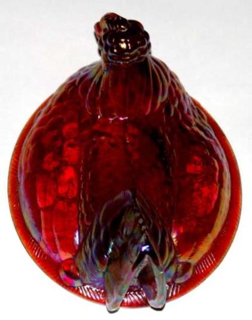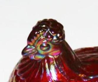 | The Atterbury 8" hen top clearly showing her red glass eyes, which prior to being applied were simply slots in the glass hen's face. When developing their copy of the Atterbury Fenton replaced the slots with the now renowned, big bulging eyes of the 8" Fenton hen top. |