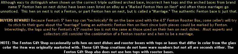 Although the Internet provides a broad marketplace from which collectors can enjoy their pursuit of Fenton hen on nest collecting, caution and common sense must be used when trading online with Sellers, many for the most part who are strangers. Many hen tops in the 7 to 8 inch and 5 inch ranges are somewhat similar to Fenton's and often mistakenly listed online and on eBay for sale as "Fenton." Per eBay's Selling Rules for Brand name goods, it is the Seller is responsible for authenticating any item with a brand name, which Fenton is, used in the title or description of an eBay auction-prior to launching it. But, don't count on it! Many Sellers have "clauses" in their listings which try to make determining whether an item is Fenton the Buyer's responsibility when eBay's rules for listing items clearly say otherwise.