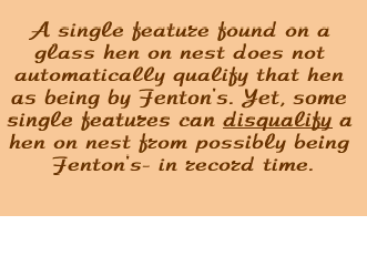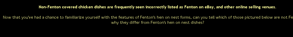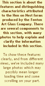 | FEATURES TO OBSERVE, STUDY AND LEARN TO RECOGNIZE We believe it is advantageous for Fenton Hen on Nest collectors to spend some time learning to recognize the features and characteristics attributed to the hen on nest forms produced by Fenton. However, we also believe it is important to know which attributes seen on hen on nest dishes listed online for sale are those that would not be found on a Fenton hen on nest. This "Reverse Engineering" approach to determining which hens listed are authentic brand name Fenton, by identifying those that are not, is effective and time saving. Although it may not help you find the Fenton hen of your dreams, it may prevent the purchase nightmares are made of. Determining which hen on nest forms are not Fenton can take collectors closer to finding brand name Fenton and avoiding a "fowl" purchase. While looking at photos of hen on nest dishes spend time specifically studying: