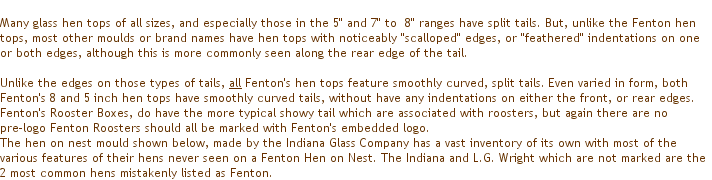 | This brief introduction is to help familiarize fellow enthusiasts with the appearance of Fenton's various hen on nest forms, while also providing general information about Fenton's hens, and other issues relative to collecting them via the Internet when many other hen on nest, and glass covered chicken dishes are listed as Fenton, while being anything but. Large photos, with close-ups of details, measurements, and information about the interesting features and characteristics of each mould shown here can be found in the separate Section designated for each of Fenton's hen on nest dishes and rooster forms. Because all Fenton roosters should be marked, its Ladies First! |